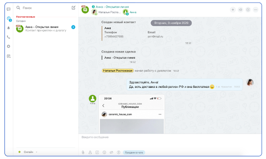 Видите в CRM всю переписку с клиентами из мессенджеров и соцсетей
