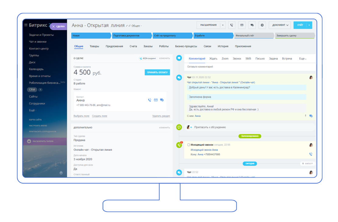 Ведите переписку с клиентом из самого Битрикс24. Открытые линии собирают сообщения в Битрикс24 из разных каналов и мессенджеров, распределяют по правилам очереди между сотрудниками и сохраняют в CRM-систему.